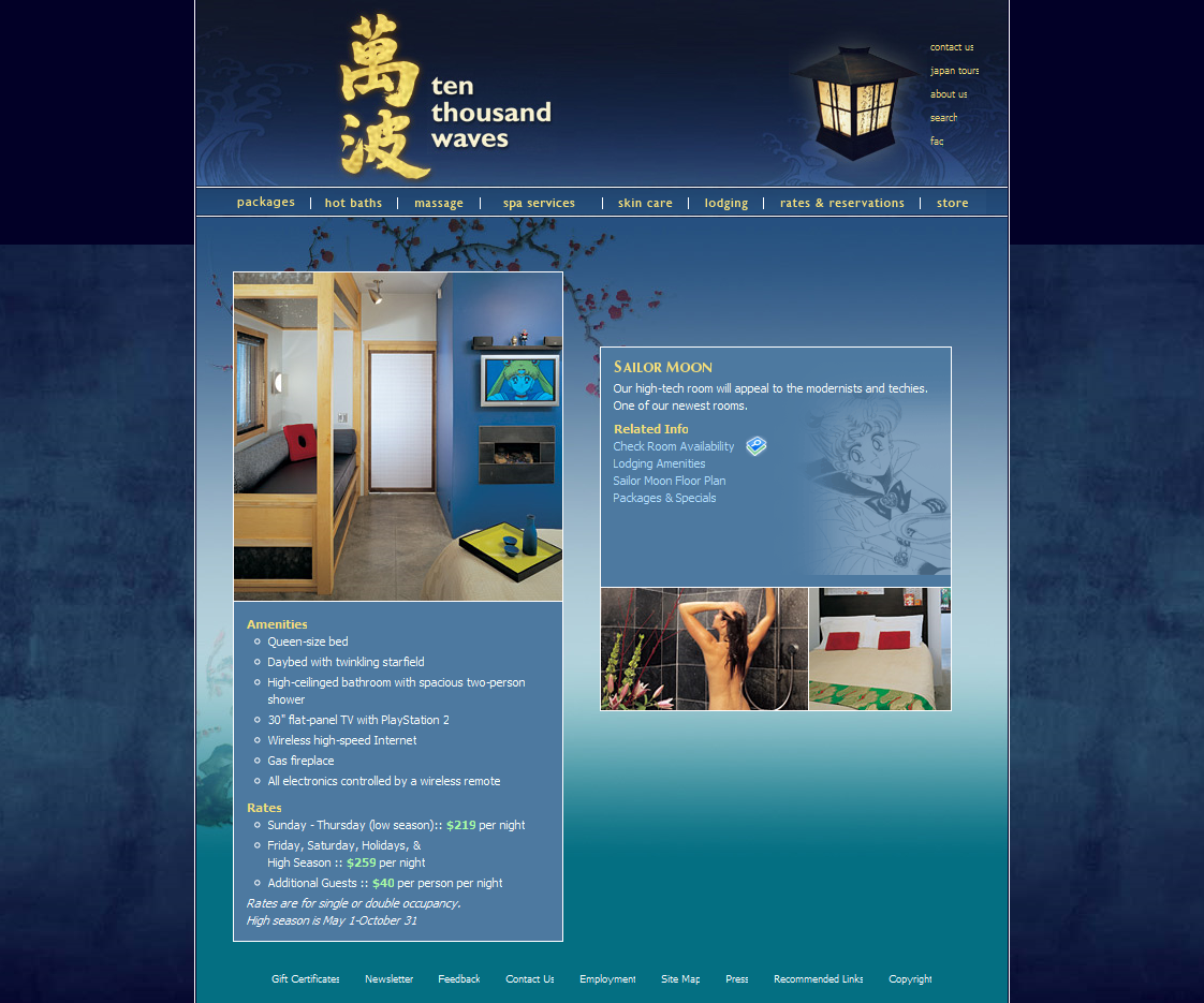 This spa features a suite called "Sailor Moon." The text about the room says "Our